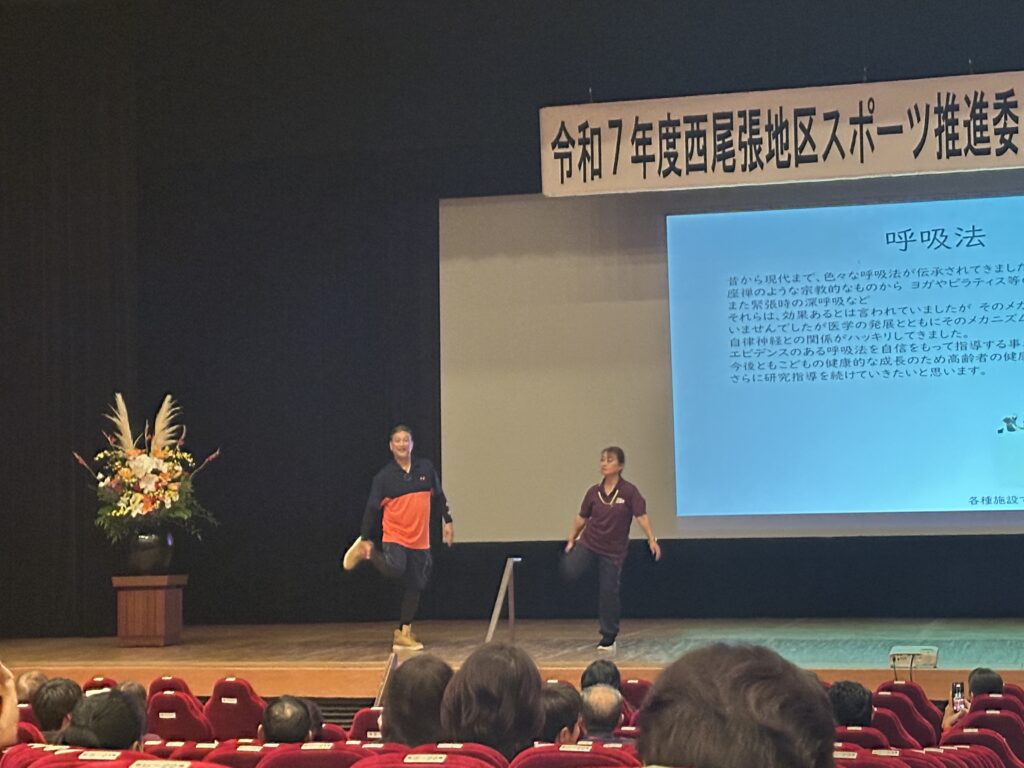 今日は柴田トレーナーが、あま市の甚目寺公民館大ホールにて西尾張地区スポーツ推進連絡協議会・研修会にて「正しい呼吸法とは」について講演いたしました。